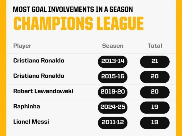 2013-14赛季,C罗在欧冠单赛季参与21粒进球,排名历史第一,2015-16赛季,C罗欧冠单赛季参与20球,与2019-20赛季的莱万并列,拉菲尼亚本赛季欧冠到目前为止已经参与19粒进球,追平2011-12赛季的梅西。